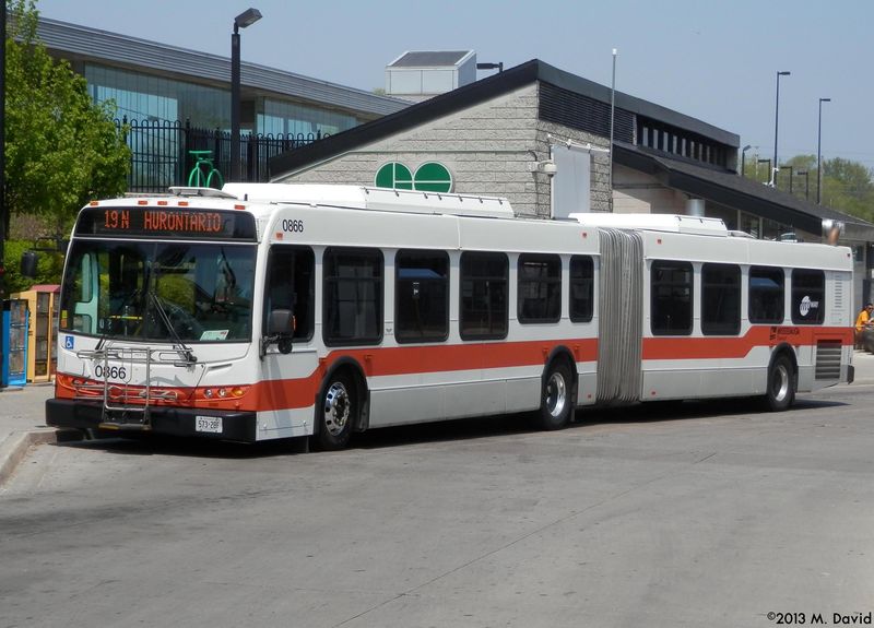 MiWay 0866, a 2008 New Flyer D60LFR, is seen waiting for passengers on route 19 Hurontario at the Port Credit GO Station.
