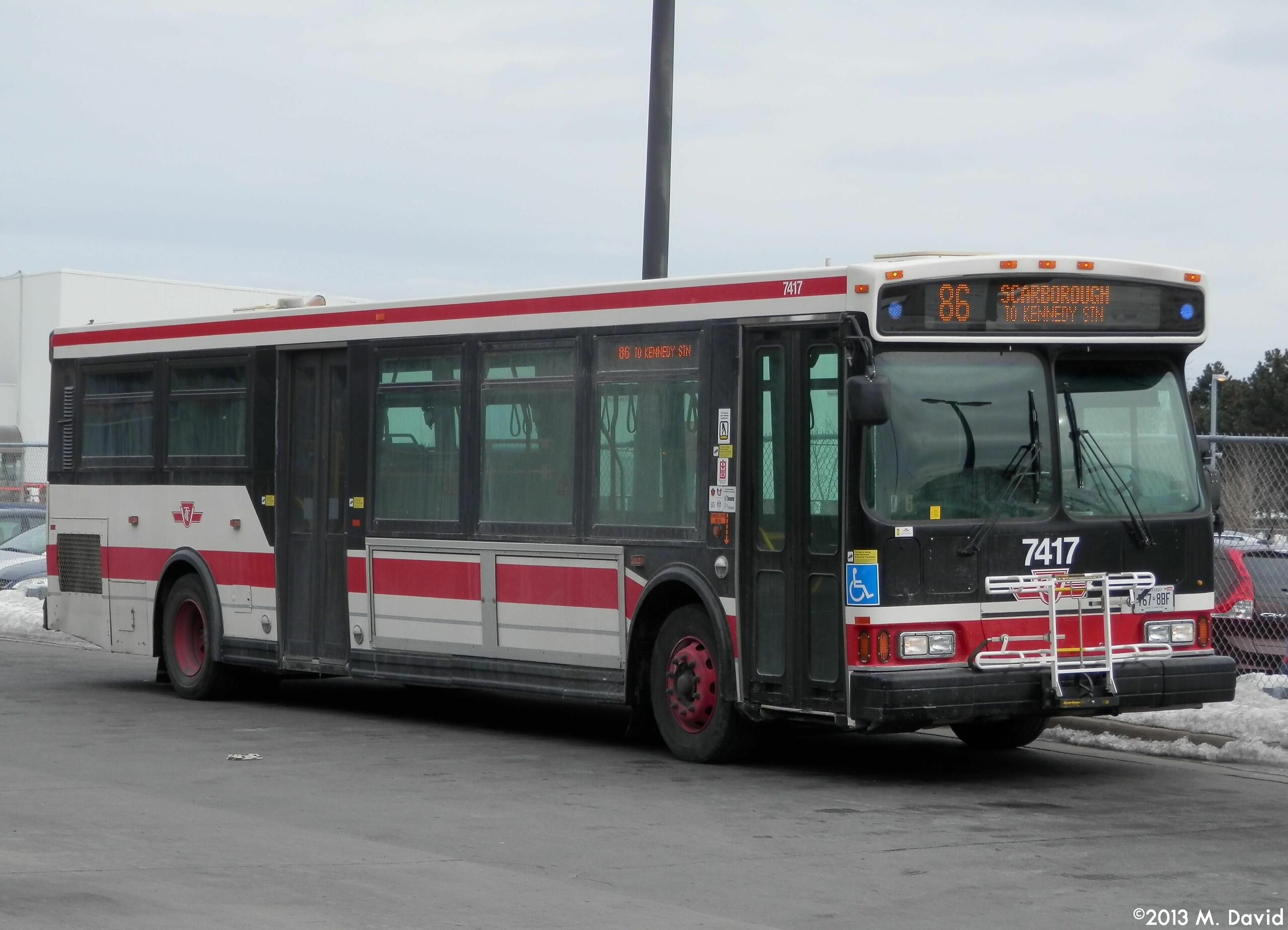 TTC 7417, a 2002 Orion VII, is seen laying over on route 86 Scarborough at Kennedy Station.