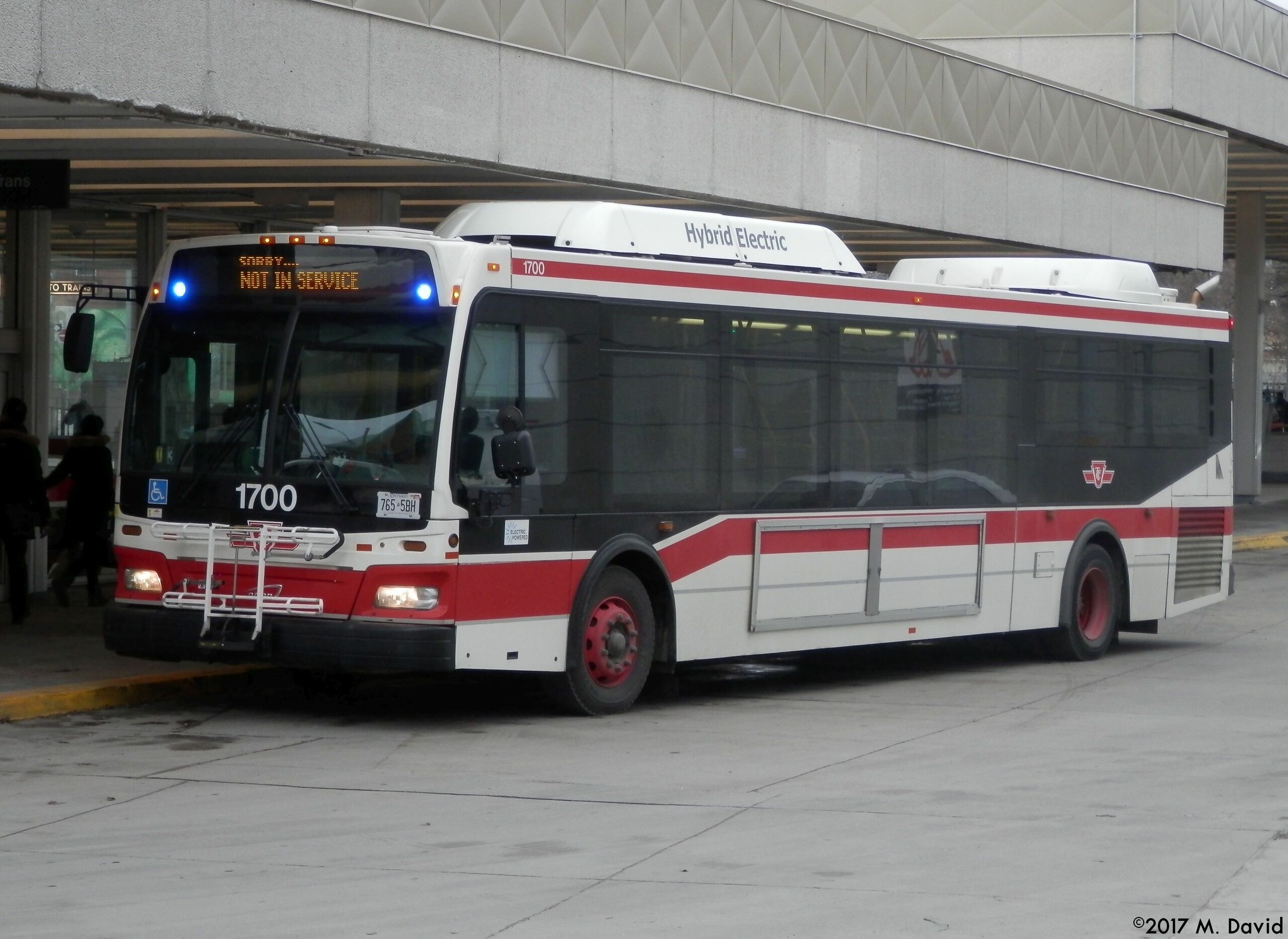 TTC 1700, a 2009 Orion VII NG HEV, is seen out of service at Bathurst Station after completing a run on route 7 Bathurst.