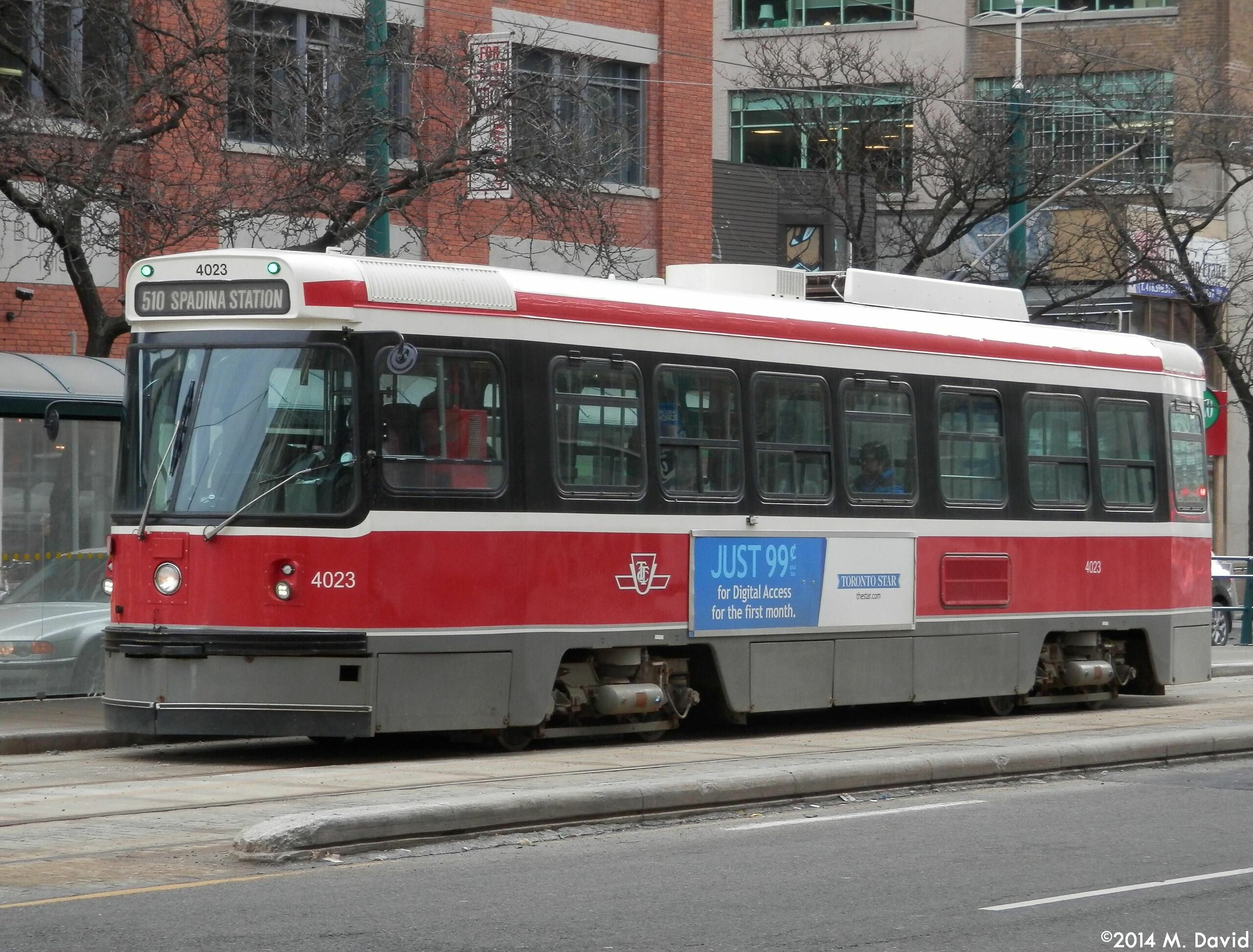 TTC 4023, a 1978-81 UTDC/Hawker Siddeley CLRV streetcar, is seen waiting for passengers on route 510 Spadina at the intersection of Spadina Ave. and Richmond St. W. in downtown Toronto.