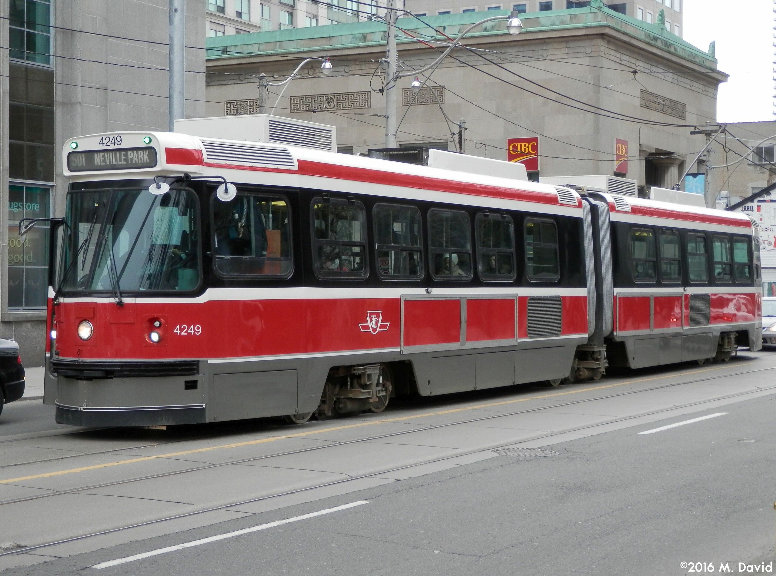 TTC 4249, a 1987-89 UTDC/Can-Car Rail ALRV streetcar, is seen waiting for passengers on route 501 Queen at the intersection of Queen St. W. and University Ave. in downtown Toronto.