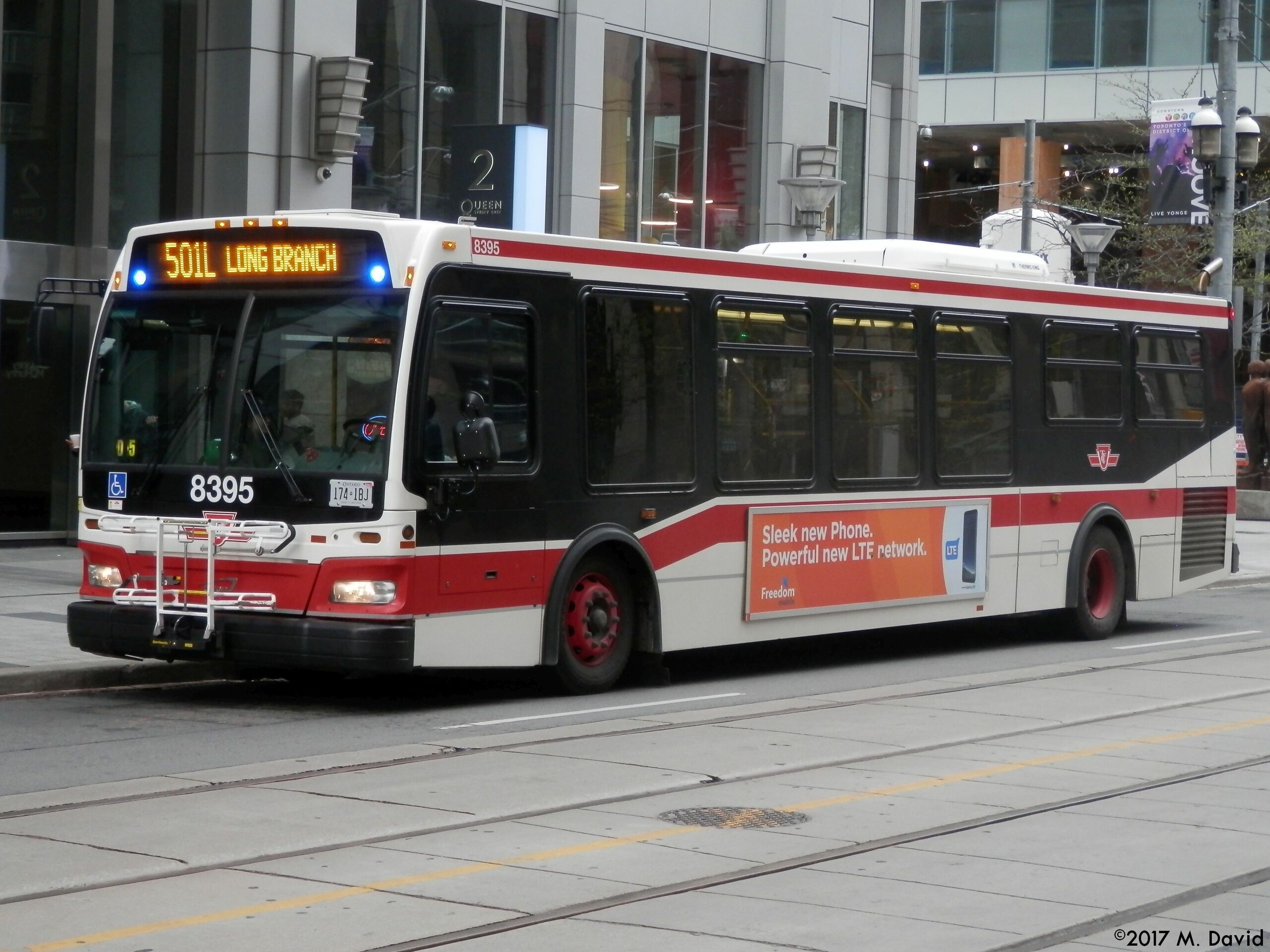 TTC 8395, a 2012 Orion VII NG, is seen waiting for passengers on route 501L Queen at the intersection of Queen St. E. and Yonge St. in downtown Toronto.