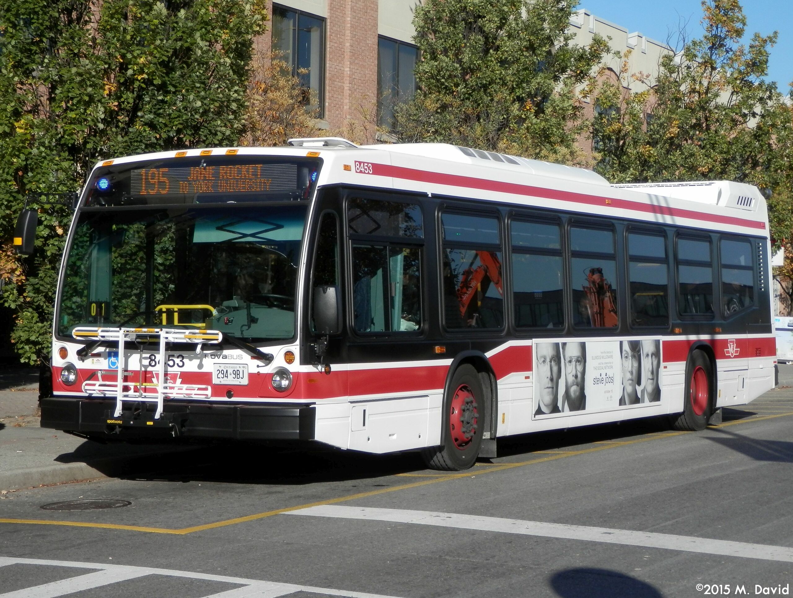 TTC 8453, a 2015 Nova Bus LFS, is seen waiting for passengers on route 195 Jane Rocket at York University.