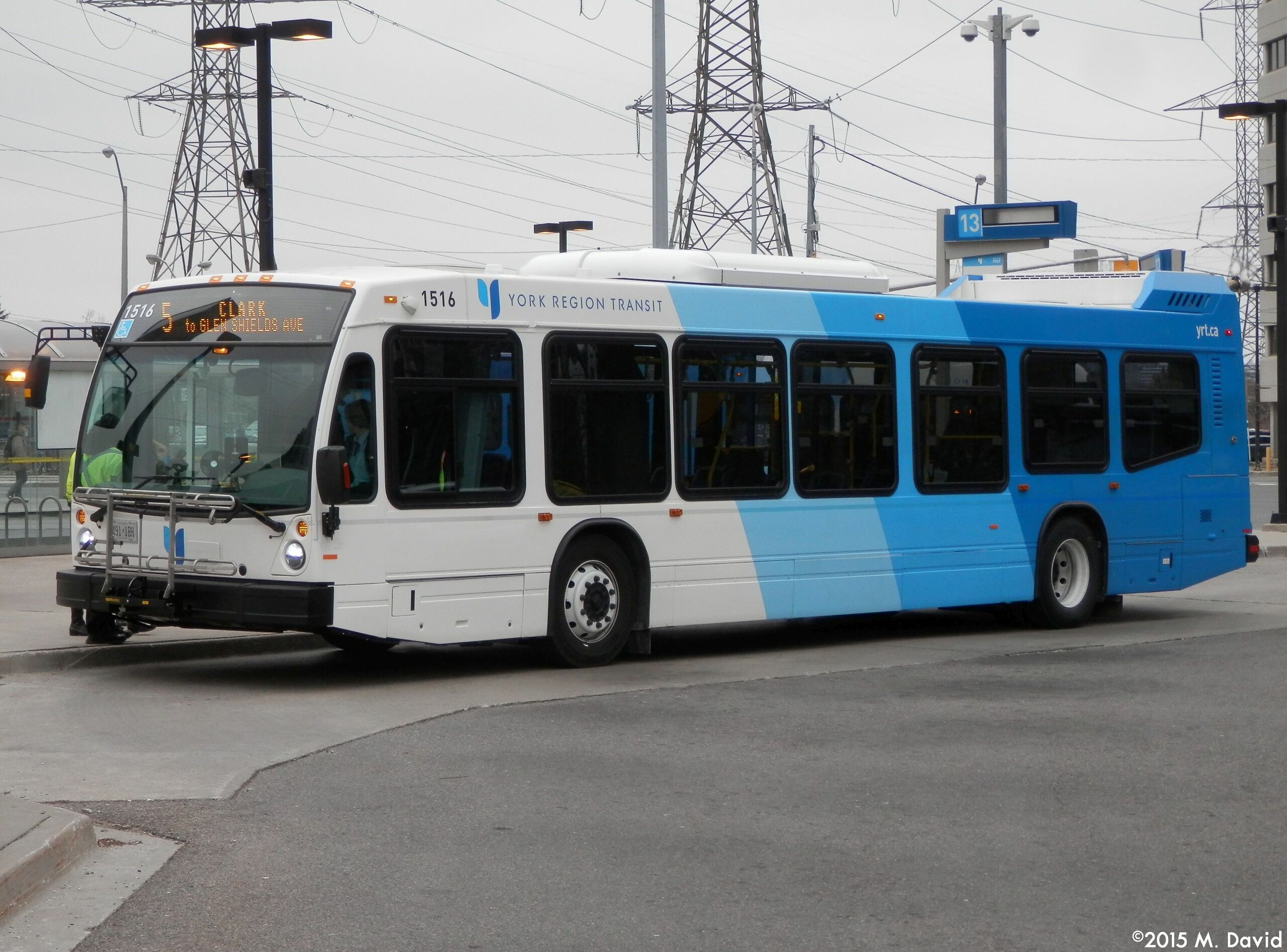 YRT 1516, a 2015 Nova Bus LFS, is seen waiting for passengers on route 5 Clark at Finch GO Bus Terminal.