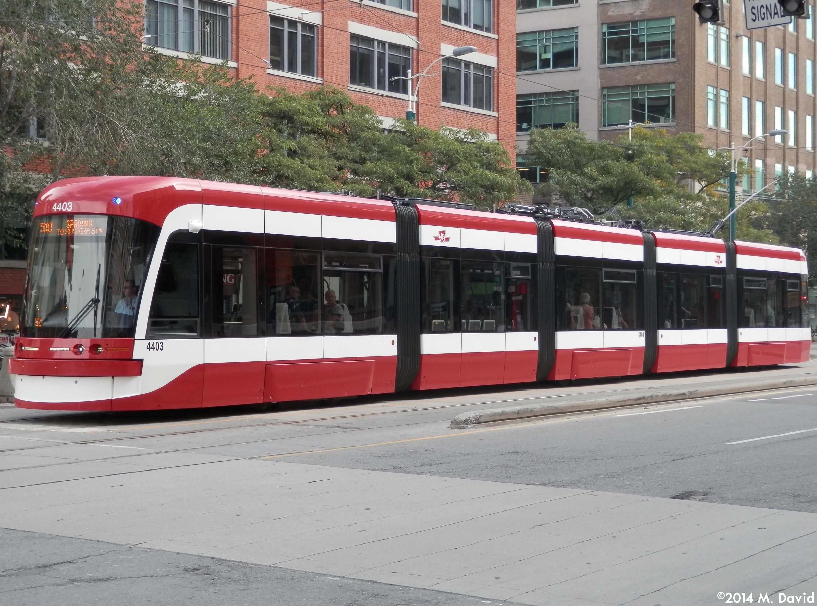 | 19:27, 30 November 2014 | TTC 4403.jpg (file) | 908 KB | TTC 4403, a 2014 Bombardier Flexity streetcar, is seen waiting for passengers on route 510 Spadina at the intersection of Spadina Ave. and Richmond St. W. in downtown Toronto. | 1 | |
