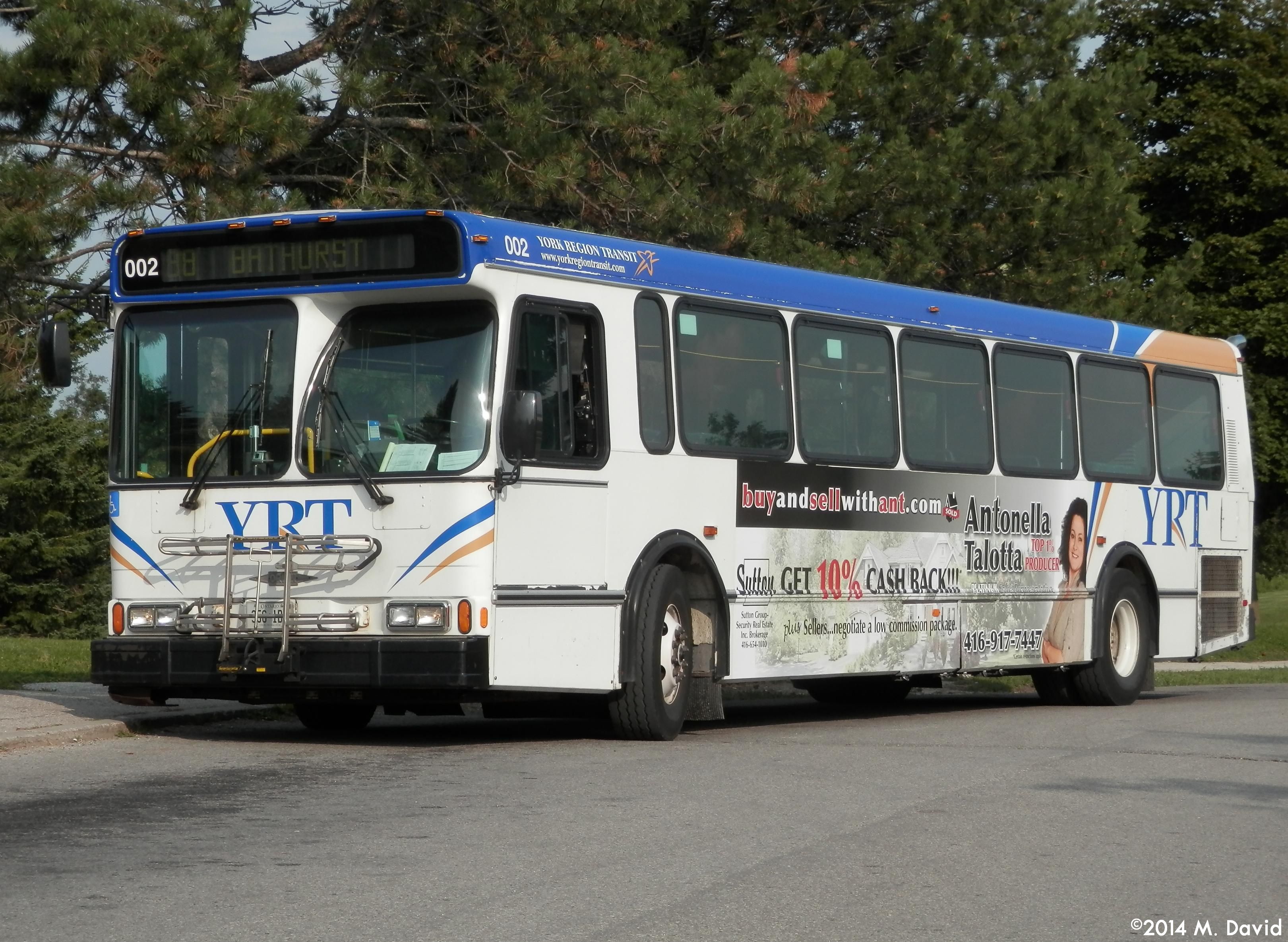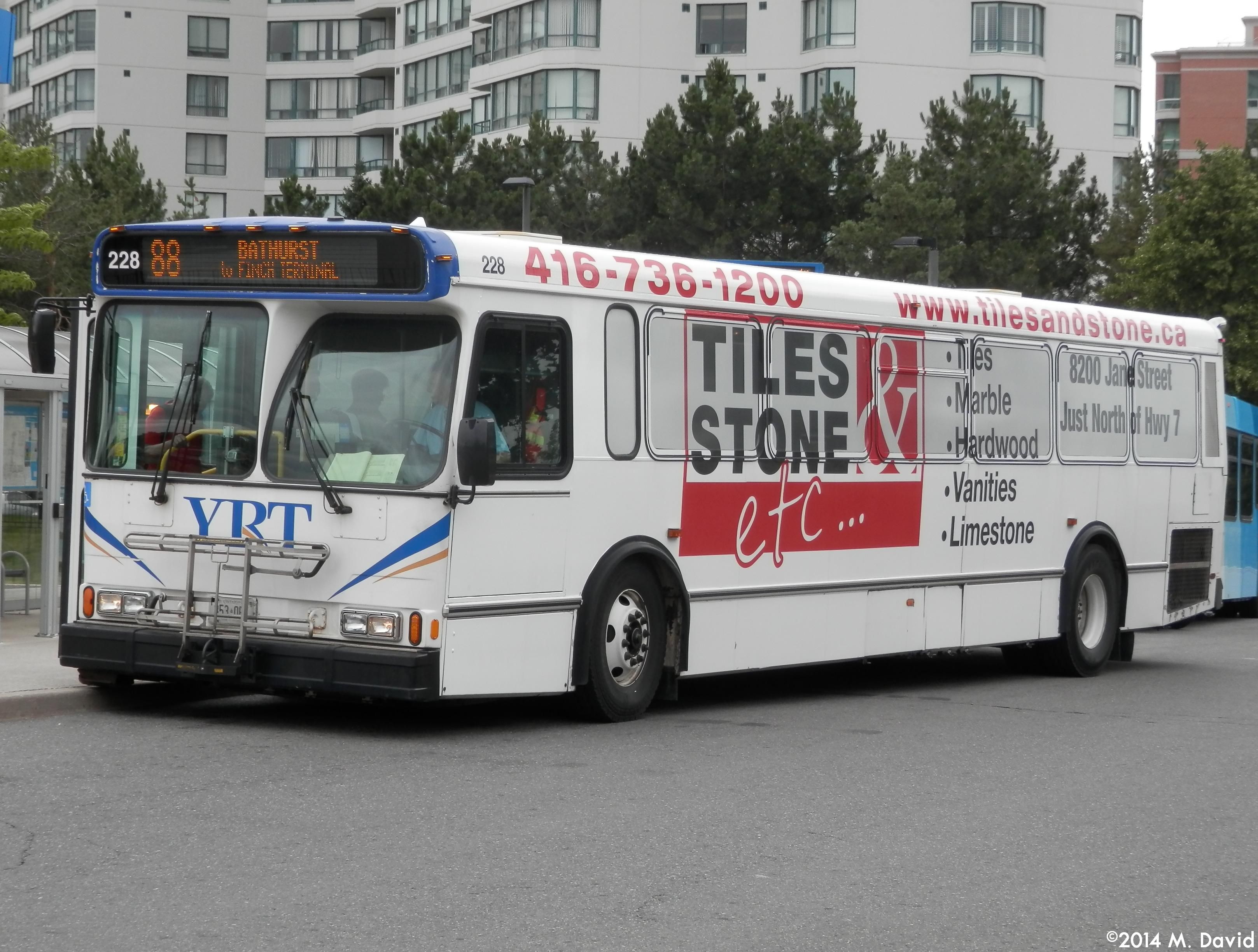 | 09:51, 5 October 2014 | YRT 228.jpg (file) | 837 KB | YRT 228, a 2002 Orion V, is seen waiting for passengers on route 88 Bathurst at Promenade Terminal. This bus is still in the old YRT livery, is one of several ex-GO Transit units purchased by YRT, and features a full wrap for Tiles & Stone Etc. | 1 |