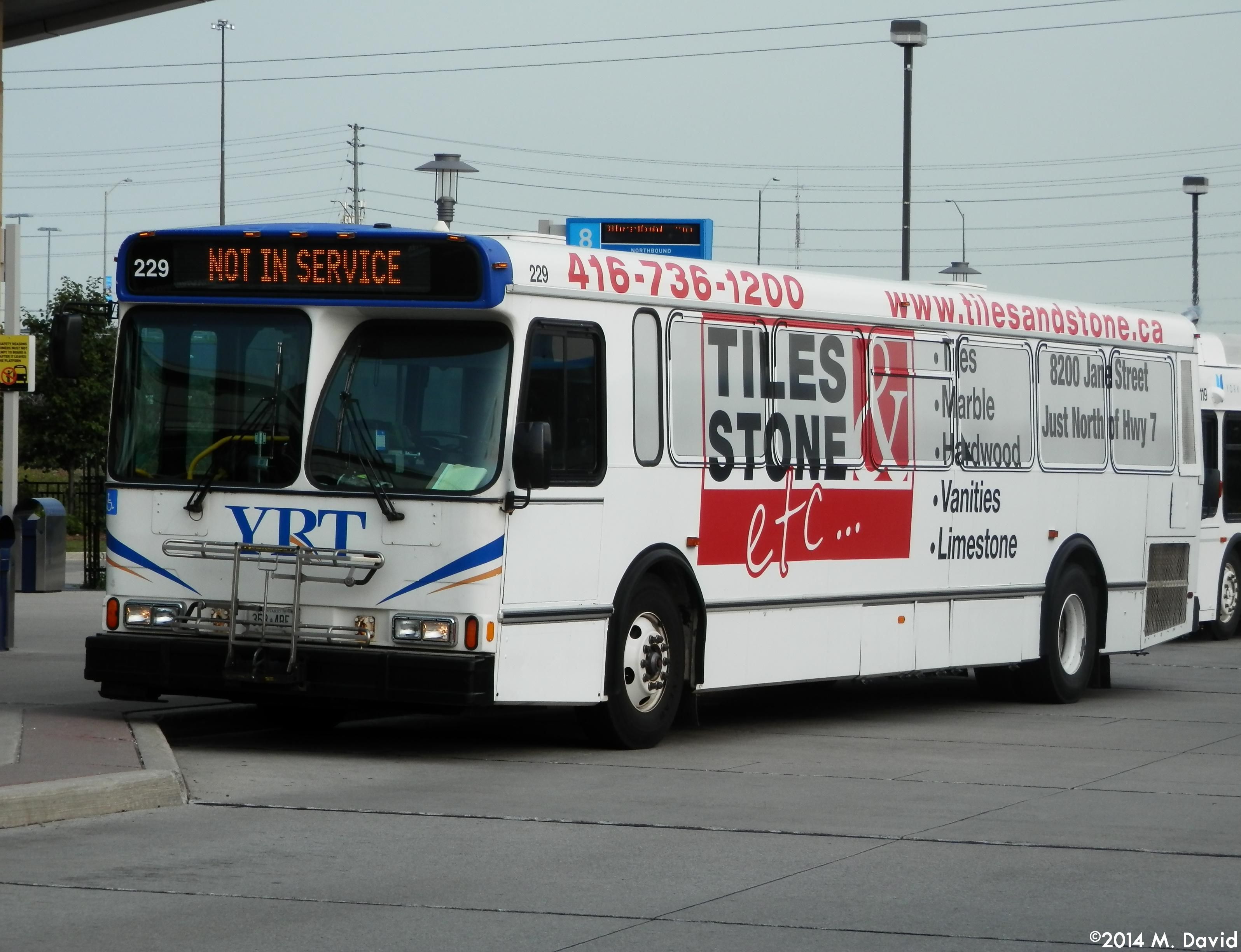 | 09:54, 5 October 2014 | YRT 229.jpg (file) | 628 KB | YRT 229, a 2002 Orion V, is seen out of service and laying over at Richmond Hill Centre Terminal. This bus is still in the old YRT livery, is one of several ex-GO Transit units purchased by YRT, and features a full wrap for Tiles & Stone Etc. | 1 | |